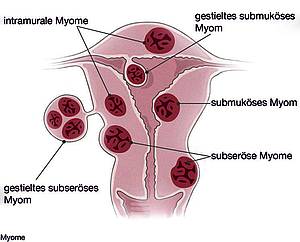 Myome sind gutartige Knotenbildungen der Gebärmuttermuskulatur. Sie können sehr groß und in Extremfällen bis zu mehreren Kilogramm schwer werden. Gebärmuttermyome kommen v.a. im gebährfähigen Alter vor, typisch ab einem Alter von 30 Jahren aufwärts.