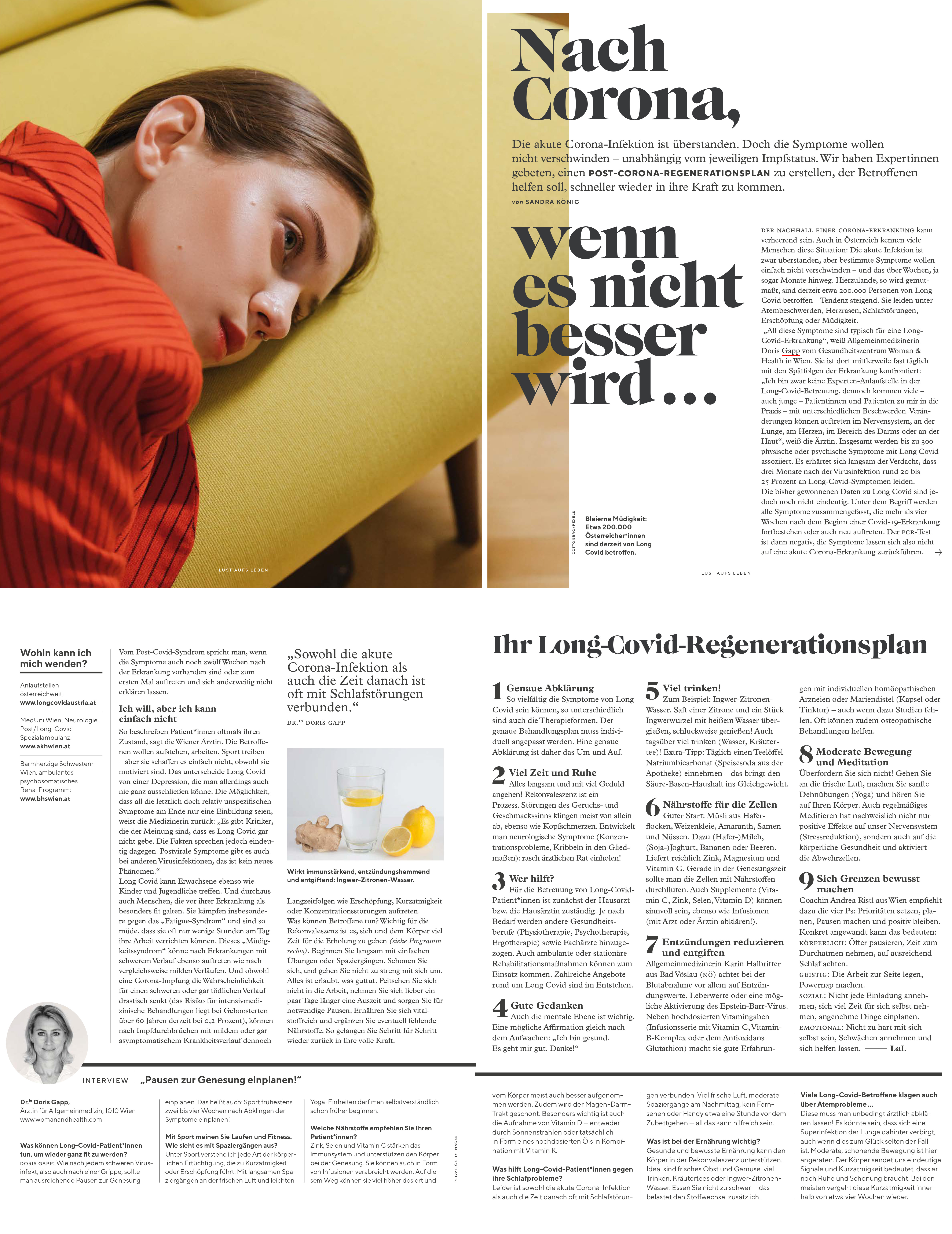 Die akute Corona-Infektion ist überstanden. Doch die Symptome wollen nicht verschwinden – unabhängig vom jeweiligen Impfstatus. Wir haben Expertinnen gebeten, einen POST-CORONA-REGENERATIONSPLAN zu erstellen, der Betroffenen helfen soll, schneller wieder in ihre Kraft zu kommen.