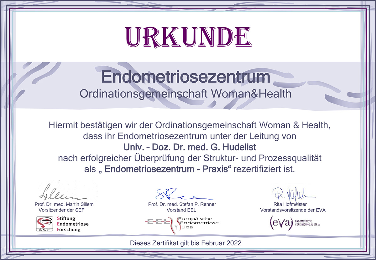 Das Ordinationszentrum Woman & Health und Univ. Prof. PD. Dr. Gernot Hudelist, MSc wurden von der SEF (Stiftung-Endometriose-Forschung) und der EEL (Europäische Endometriose Liga) nach eingehender Prüfung und nach international gültigen Kriterien (Euroendozert) abermals erfolgreich als Endometriosepraxis rezertifiziert. Damit ist gewährleistet, dass Patientinnen nach strikten und validierten Vorgaben und ausgewählten Qualitätskriterien hinsichtlich einer möglichen Endometrioseerkrankung nach höchsten Standards diagnostiziert, beraten und weiterführend behandelt werden.