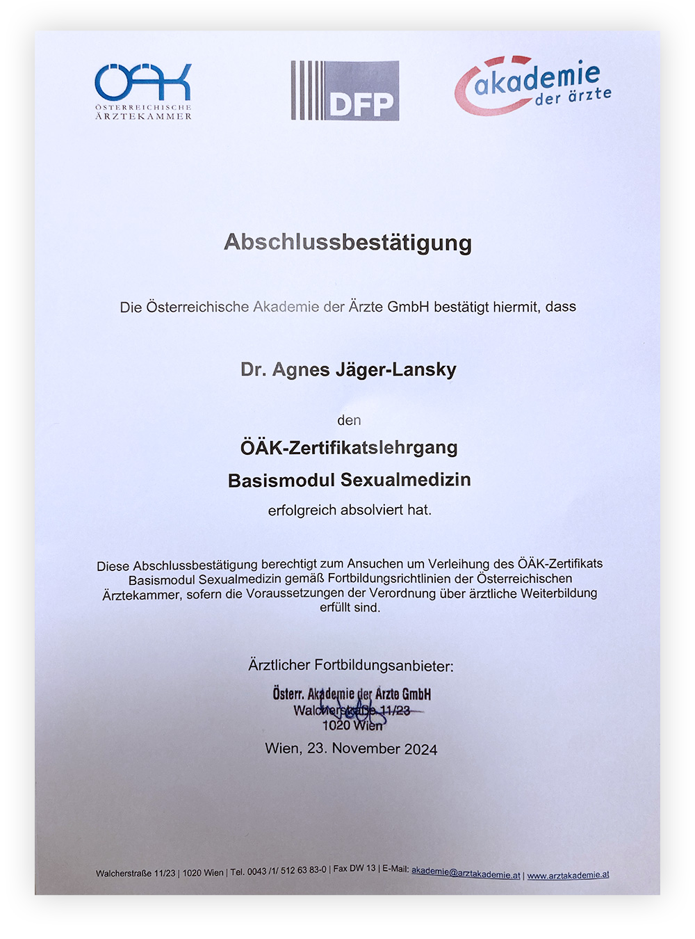 Der Behandlungsvertrag kommt in der ambulanten Privatklinik mit der Woman & Health Krankenanstalts GmbH zustande, im Ordinationszentrum mit dem jeweiligen Privatordinationsinhaber.